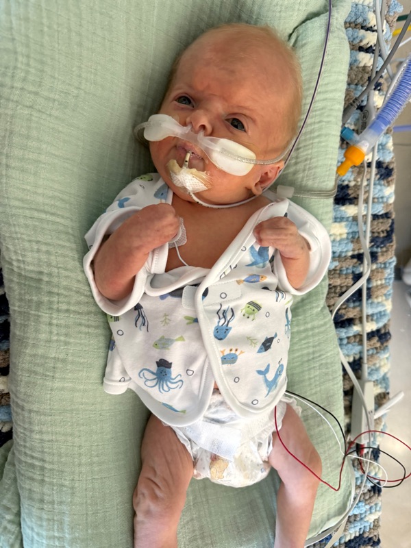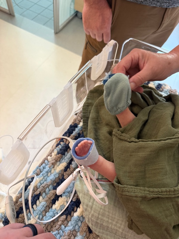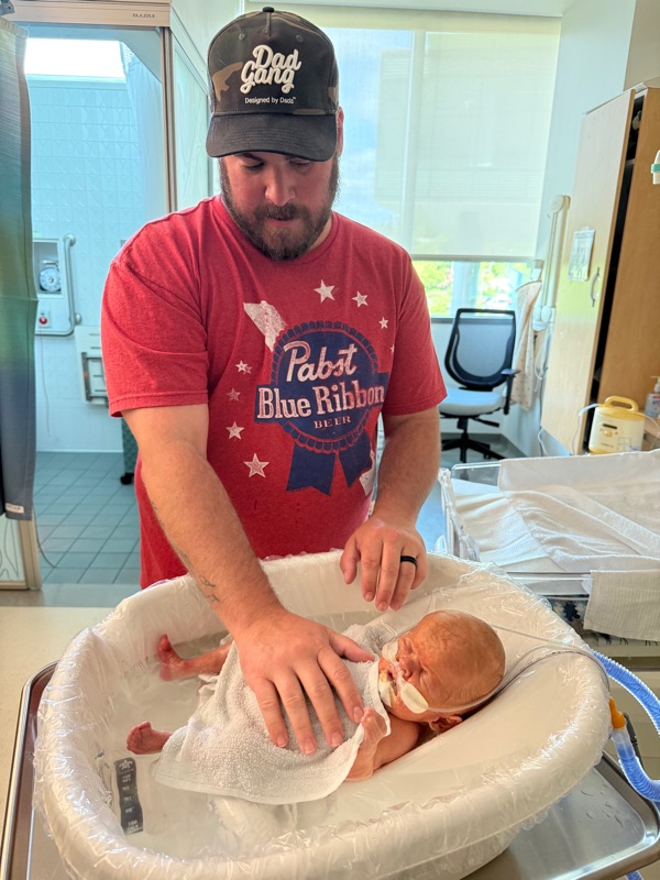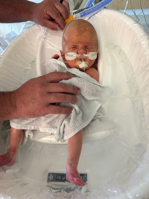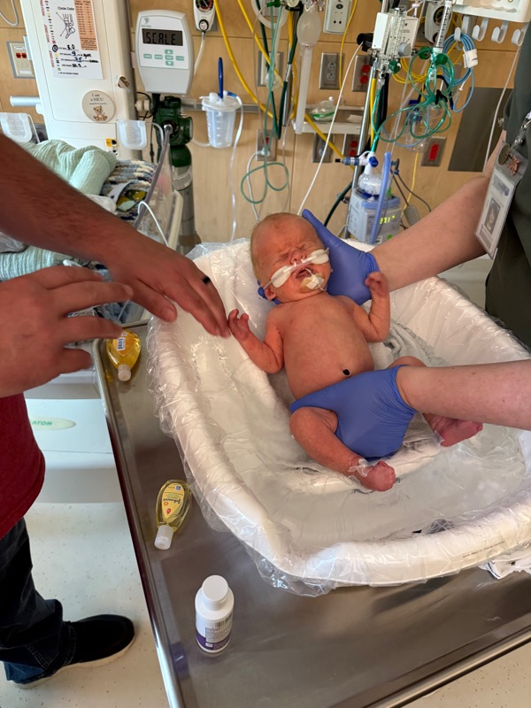 with this today, we had a very relaxing day with him. We got to hold him for quite some time and we also gave him his very first tub bath. He was not sure about it at first, but once we got the warm water on him, he thoroughly enjoyed it. after the bath, he was up for about three hours, looking around and taking in the entire room during this time, two of his favorite nurses stop by to check in on him as they had not seen him since he had his breathing tube taken out. They were very impressed on how well he is doing and surprised to see his pick line and IV lines out as well.