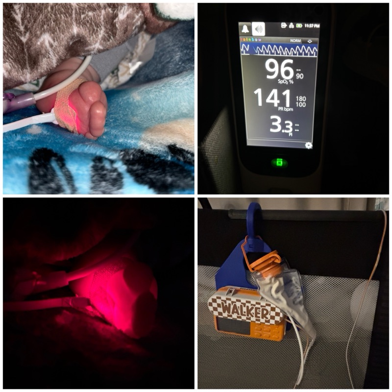 Through the night at 12AM, 3AM, 6AM, Walker is fed by the feeding tube. During this time he is comfortably swaddled up like a burrito and generally sleeps soundly through the night. Also at night Walker is monitored by a sensor medically taped to his left foot for his SPO2 (oxygen) levels and blood pressure rates. Some nights, the sensor alarmed hourly - and one night it alarmed up to five times in an hour! After the five times, I replaced the sensor tape and it corrected. Some nights there were only one to two alarms, but it always corrected itself by the time I frantically jumped up to look and see what was going on. It was always the SPO2 levels that alarmed, going below 90; never the blood pressure rising over 180, thank goodness.