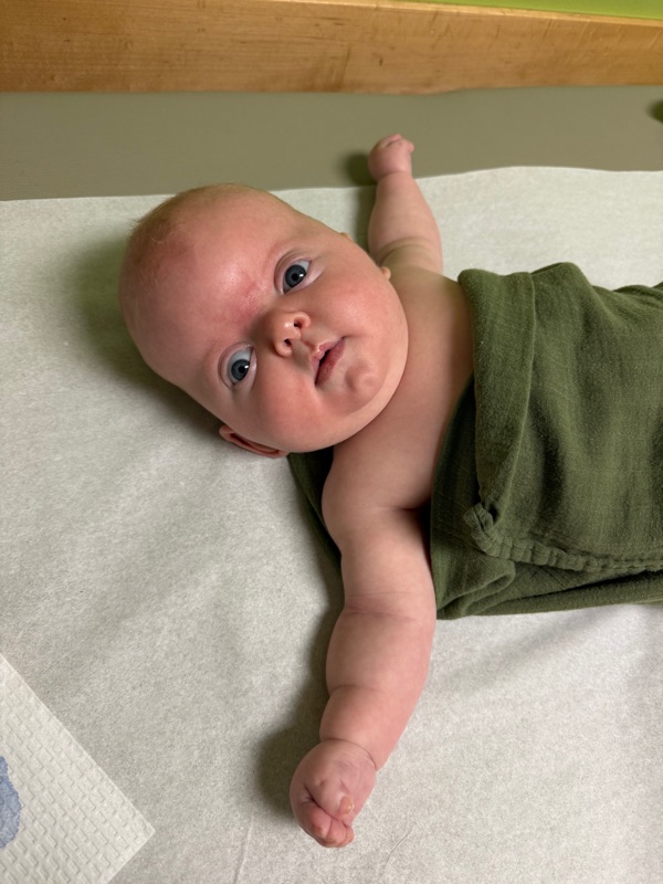Walker is 3 months old today! Holy cow how time is flying. Brandi and I are so excited that he is here with us and growing so fast. We had a very busy day for his 3 months old day. We were at children’s starting at 7:30 for a neurologist appointment were he weighed in at 6.36 kg (14 pounds!) and 24”! The neurologist checked his reflexes, strength and range of motion. With his big head we are going to have to start working on his neck exercises a little more that was the only place they said he needed some help but they are happy with how he is developing and said that we don’t need to schedule a follow up with them! What was very cool is one of the doctors that met Walker second day of life was there during this appointment. She also worked with him in the nicu for two weeks as well so it was very cool to see her as well and she was impressed with how big he has gotten!